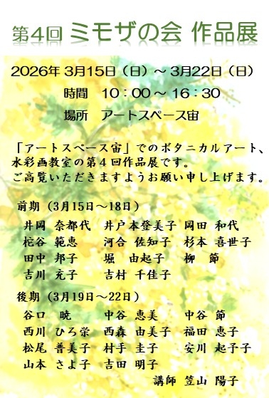 【開催】第4回 ミモザの会 作品展(「アートスペース宙」でのボタニカルアート・水彩画教室生徒の第3回作品展)を開催しました。<2026年3月15日(日)~3月22日(日)10:00~16:30>